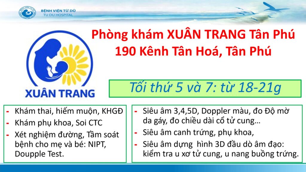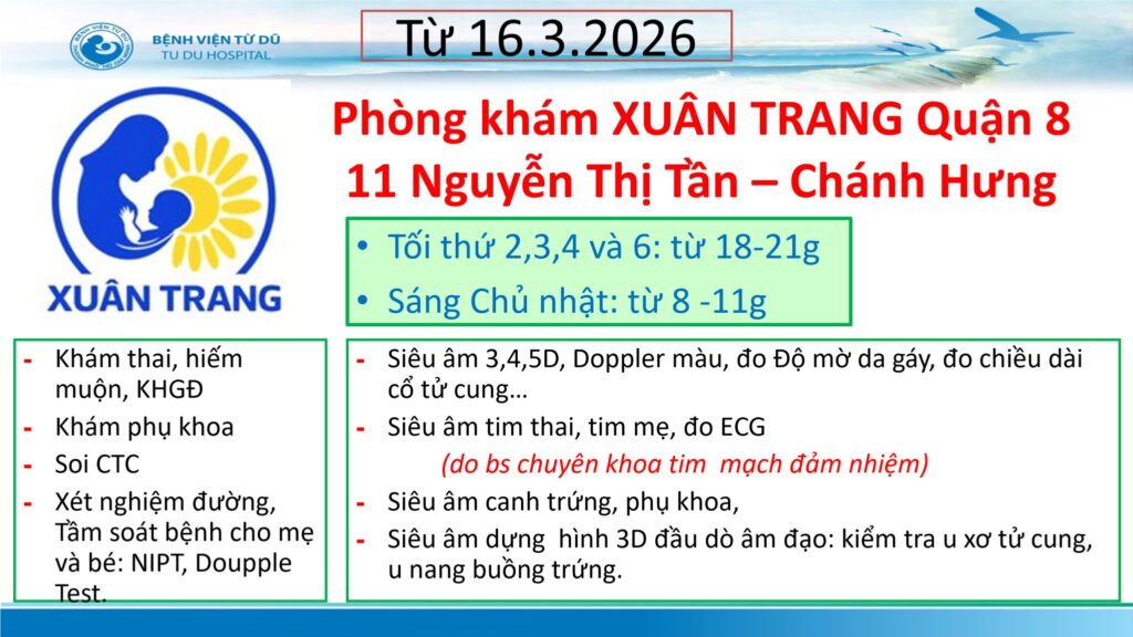Phòng khám Sản Phụ Khoa Hiếm Muộn Siêu âm 5D Xuân Trang, nơi BS. Nguyễn Xuân Trang đặt trọn tâm huyết, là hai ngôi nhà nhỏ ấm áp tại 11 Nguyễn Thị Tần, Phường 2, Quận 8 và 190 Kênh Tân Hóa, Phường Phú Trung, Quận Tân Phú, TP. Hồ Chí Minh. Được xây dựng với mong muốn ôm trọn từng khoảnh khắc thiêng liêng của hành trình làm mẹ, phòng khám không chỉ mang đến dịch vụ chăm sóc sức khỏe sinh sản toàn diện mà còn là nơi lan tỏa sự an lành. Nhờ công nghệ siêu âm 5D và trí tuệ nhân tạo (A.I.), những hình ảnh đầu tiên của bé yêu hiện lên rõ nét, giúp mẹ yên tâm, gia đình hạnh phúc. Ở đây, mọi lo lắng đều tan biến, thay vào đó là sự tin tưởng và niềm vui được nâng niu từng ngày.